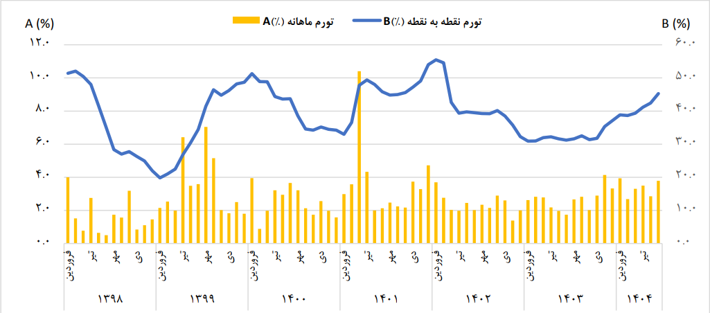 منظور از تورم نقطه به نقطه، درصد تغییر عدد شاخص قیمت نسبت به ماه مشابه سال قبل است. در شهریور ماه ۱۴۰۴، تورم نقطه به نقطه خانوارهای کشور ۴۵.۳ درصد بوده است؛ یعنی خانوارهای کشور به طور میانگین، ۴۵.۳ درصد بیشتر از شهریور ماه ۱۴۰۳ برای خرید یک «مجموعه کالاها و خدمات یکسان» هزینه کردهاند. تورم نقطه به نقطه شهریور ماه ۱۴۰۴، در مقایسه با ماه قبل ۲.۹ واحد درصد افزایش داشته است.