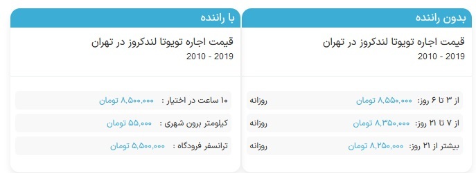 اجاره لندکروز همراه با راننده هم برای مدت ۱۰ ساعت ۸.۵ میلیون تومان میشود.